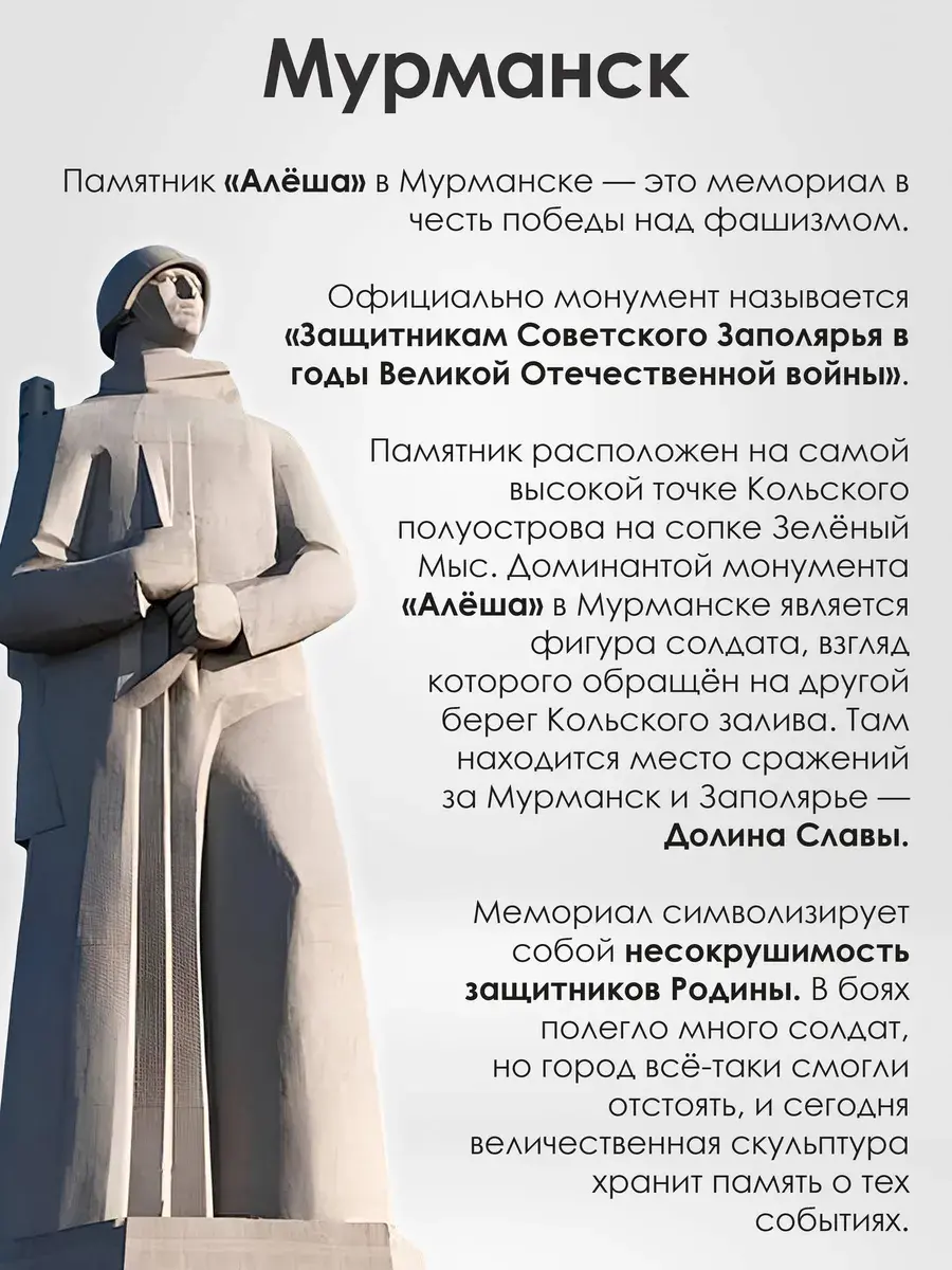 В нашем ассортименте представлена историческая линейка чехлов. За выдающиеся заслуги перед Родиной, героизм, мужество и стойкость в годы Великой Отечественной Войны, многим городам присвоено почетное звание «Город-Герой» и возведены монументы. Город – герой Мурманск. Мемориал «Защитникам Советского Заполярья в годы Великой Отечественной войны» (Памятник «Алеша»).
